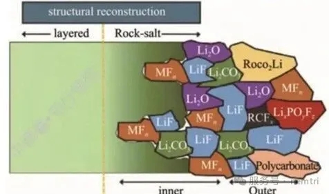 CEI膜是由正极中的锂离子和电解液发生的副反应产生的化合物组成:首次充电时发生脱出并扩散过渡金属离子从正极溶解到电解液中,并由这些金属离子形成的产物也可以作为CEI膜重新沉淀到正极颗粒表面。CEI膜对正极会起到保护作用,阻碍正极和电解液的进一步反应,提高正极脱锂的稳定性。